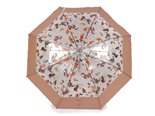 Průhledný deštník s barevným potiskem koček s motýly je ideální volbou pro všechny milovnice hravých módních doplňků. Je vystřelovací, okraj má ozdobený širokým barevným lemem. Konstrukce deštníku je z kovového drátu a pružných lamel, tvoří osm polí. Díky nim je velice pevný, neohne se ani za největšího nečasu. Klasická tyč je zakončená pevnou rukojetí. Hloubka deštníku je 25 cm.