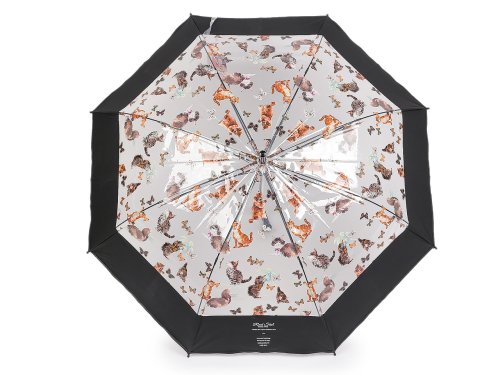 Průhledný deštník s barevným potiskem koček s motýly je ideální volbou pro všechny milovnice hravých módních doplňků. Je vystřelovací, okraj má ozdobený širokým barevným lemem. Konstrukce deštníku je z kovového drátu a pružných lamel, tvoří osm polí. Díky nim je velice pevný, neohne se ani za největšího nečasu. Klasická tyč je zakončená pevnou rukojetí. Hloubka deštníku je 25 cm.