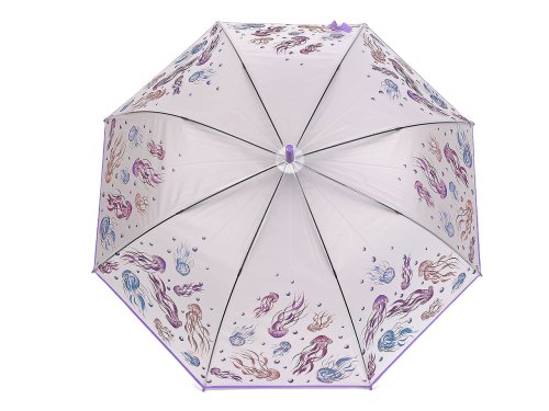 Průsvitný deštník s barevným potiskem bude slušet dívkám i ženám. Deštník je vystřelovací, konstrukci má z kovového drátu a pružných lamel, tvoří osm polí. Díky nim je velice pevný, neohne se ani za největšího nečasu. Klasická tyč je zakončená pevnou rukojetí. Hloubka deštníku je 27 cm.