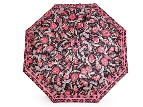 Velký dámský deštník je skládací, plně automatický Je vyrobený z kvalitního materiálu. Na potahu deštníku je poutavý paisley motiv. Deštník má vystřelovací / sestřelovací mechanizmus. Rozevře i zavře se stisknutím tlačítka se šipkou nahoru nebo dolů. Rukojeť deštníku je plastová, opatřená poutkem. Konstrukce deštníku se skládá z osmi polí. Součástí deštníku je ochranný obal. Hloubka deštníku je 21 cm. Celková délka je 56 cm. Délka složeného deštníku je 30 cm.