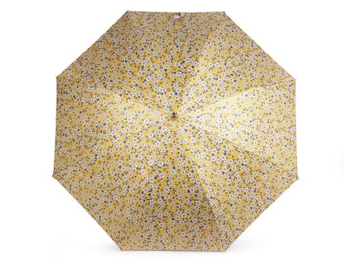 Velký dámský deštník s potiskem květů je vystřelovací, konstrukci má z kovového drátu a pružných lamel, které tvoří osm polí. Díky nim je velice pevný, neohne se ani za největšího nečasu. UV filtr vás ochrání před slunečním zářením. Klasická tyč je zakončená pevnou rukojetí z eko kůže. Dolní strana potahu je černá. Hloubka deštníku je 24 cm.