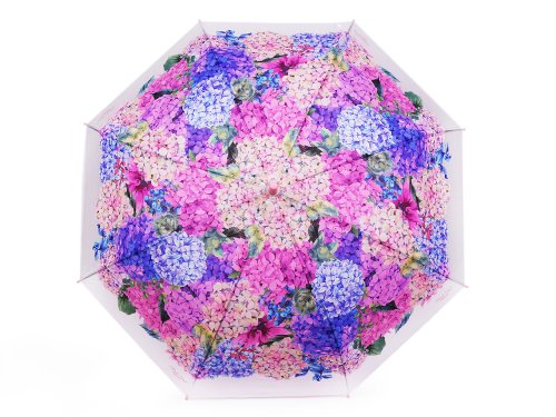 Průsvitný deštník s potiskem hortenzií je vystřelovací, konstrukci má z kovového drátu a pružných lamel, které tvoří osm polí. Díky nim je velice pevný, neohne se ani za největšího nečasu. Klasická tyč je zakončená pevnou rukojetí. Hloubka deštníku je 26 cm.