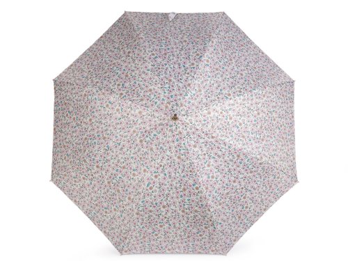 Velký dámský deštník s potiskem květů je vystřelovací, konstrukci má z kovového drátu a pružných lamel, které tvoří osm polí. Díky nim je velice pevný, neohne se ani za největšího nečasu. UV filtr vás ochrání před slunečním zářením. Klasická tyč je zakončená pevnou rukojetí z eko kůže. Dolní strana potahu je černá. Hloubka deštníku je 24 cm.