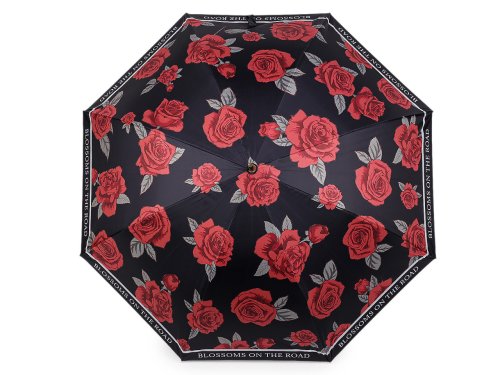 Velký dámský deštník s květinovým motivem je stylovým a praktickým doplňkem pro každou ženu. Díky svému atraktivnímu designu s květy, dodá šarm i těm nejzamračenějším dnům. Je vystřelovací, konstrukci má z kovového drátu a pružných lamel, které tvoří osm polí. Díky nim je velice pevný, neohne se ani za největšího nečasu. UV filtr vás ochrání před slunečním zářením. Klasická tyč je zakončená pevnou rukojetí z eko kůže. Dolní strana potahu je černá. Hloubka deštníku je 24 cm.