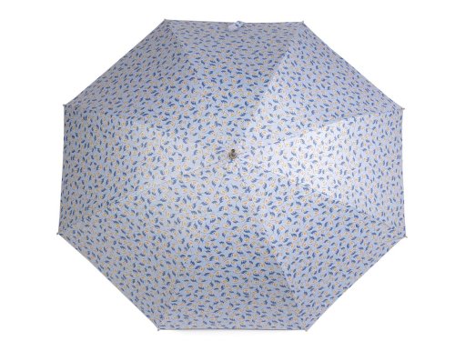 Velký dámský deštník s potiskem malých květů je vystřelovací, konstrukci má z kovového drátu a pružných lamel, které tvoří osm polí. Díky nim je velice pevný, neohne se ani za největšího nečasu. UV filtr vás ochrání před slunečním zářením. Klasická tyč je zakončená pevnou rukojetí z eko kůže. Dolní strana potahu je černá. Hloubka deštníku je 24 cm.