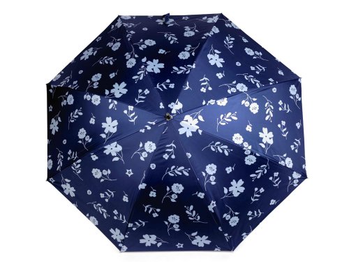 Velký dámský deštník má potah s motivem jednobarevných květů. Je vystřelovací, konstrukci má z kovového drátu a pružných lamel, které tvoří osm polí. Díky nim je velice pevný, neohne se ani za největšího nečasu. UV filtr vás ochrání před slunečním zářením. Klasická tyč je zakončená pevnou rukojetí z eko kůže. Dolní strana potahu je černá. Hloubka deštníku je 24 cm.