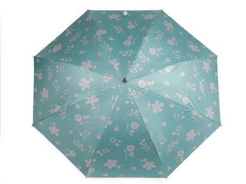 Velký dámský deštník má potah s motivem jednobarevných květů. Je vystřelovací, konstrukci má z kovového drátu a pružných lamel, které tvoří osm polí. Díky nim je velice pevný, neohne se ani za největšího nečasu. UV filtr vás ochrání před slunečním zářením. Klasická tyč je zakončená pevnou rukojetí z eko kůže. Dolní strana potahu je černá. Hloubka deštníku je 24 cm.