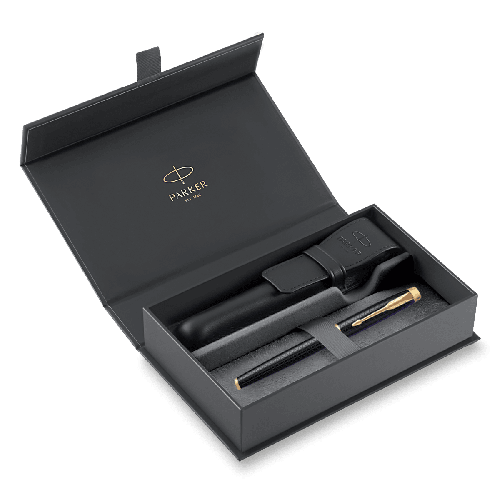 Dárková kazeta obsahuje:, * plnicí pero Parker IM Premium Black GT, * černé kožené pouzdro Parker, * voucher Akademie psaní