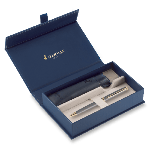 Dárková kazeta obsahuje:, * kuličkové pero Waterman Hémisphère Stone Grey GT, * modré PU pouzdro Waterman, * voucher Akademie psaní