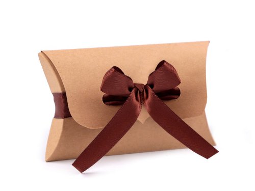 Papírovou krabičku s mašlí využijete na zabalení drobného dárku. Má tvar polštářku, uzavírá se pomocí přiložené saténové stuhy. Můžete do ní uložit malé dárečky. Je vhodná na svatby, narozeniny, vánoce i Valentýna. [Stuha je široká 1,5 cm.]