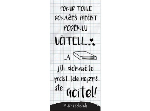 Řekněte „děkuji“ sladce a stylově! Tato dárková mléčná čokoláda o hmotnosti 100 g je ideálním způsobem, jak vyjádřit vděčnost panu učiteli za jeho trpělivost, podporu a každodenní úsilí. Vtipný obal s motivem „Poděkuj učiteli…“ dodává čokoládě osobní nádech a udělá radost na první pohled.
