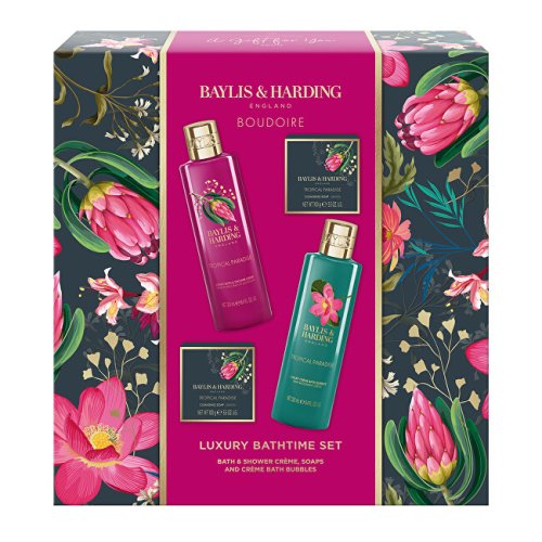 Trendy kolekce Boudoire - Tropical Paradise přináší exotický květinový design s moderním nádechem a špetkou luxusu. Odvážná paleta fuchsiové růžové a smaragdově zelené je doplněna zlatými detaily, které celé řadě dodávají výjimečný charakter. Pečující produkty a nádherné dárkové sady doprovází tropická vůně banánu, broskve a pomerančového květu.