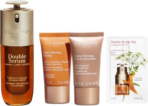 Intenzivní sérum proti stárnutí pleti (Double Serum Complete Age Control Concentrate) 50 ml Zpevňující a rozjasňující denní krém Extra Firming Energy (Radiance-boosting Wrinkle-control Day Cream) 15 ml Krém na krk a dekolt Extra-Firming (Neck & Decollete Care) 15 ml Omlazující oční sérum (Double Eye Serum) 0,9 ml