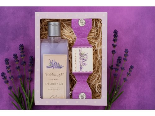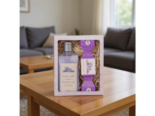 Kosmetický balíček pro ženu Lavender Style obsahuje sprchový gel 200 ml a ručně vyráběné tuhé mýdlo 30 g.