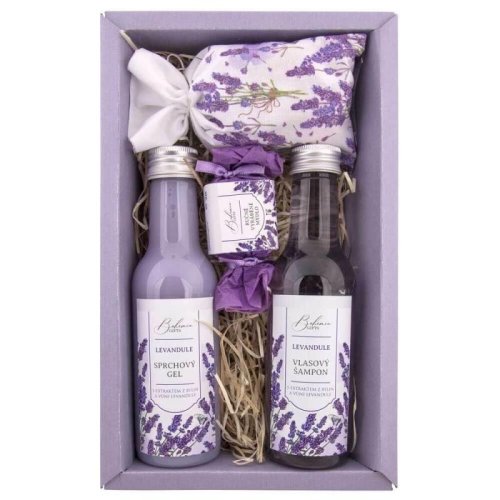 Dárková kosmetická sada levandulové kosmetiky obsahuje sprchový gel 200 ml, vlasový šampon 200 ml, mýdlo 30 g a koupelová sůl 150 g s bylinným extraktem a vůní levandule. Krásný dárek pro ženu.