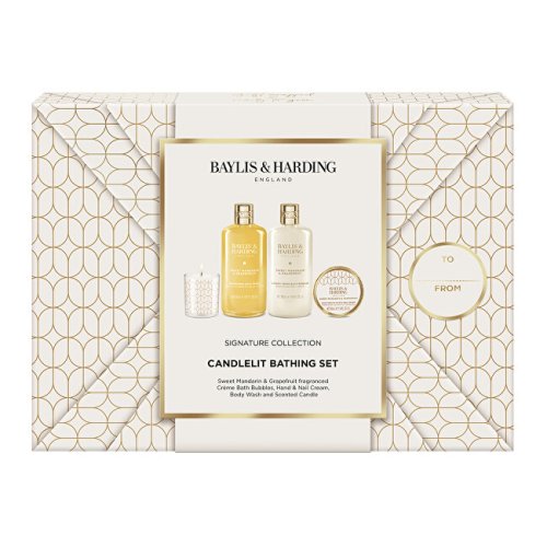 Sprchový gel (Body Wash) 300 ml Pěna do koupele (Bath bubbles) 300 ml Krém na ruce (Hand & Nail Cream) 50 ml Vonná svíčka (Scented Candle) 60 g