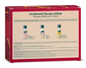 Masážní oleje Kneipp obsahují účinné látky rostlinného původu, jsou bez konzervantů, parafínů, silikonu a minerálních olejů. Při masáži uvolňují éterické oleje, které pokožku nádherně provoní a zároveň ji blahodárně vyživí. Nezanechávají mastný film a přesto pokožka po jejich použití zůstává dlouhodobě vláčná. Pravidelná masáž zlepšuje spánek, odstraňuje únavu a působí proti stresu. Sada obsahuje: