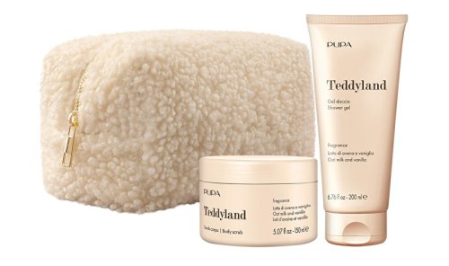 Sprchový gel Oat Milk and Vanilla Teddyland (Shower Gel) 200 ml Tělový peeling Oat Milk and Vanilla Teddyland (Body Scrub) 150 ml Kosmetická taška