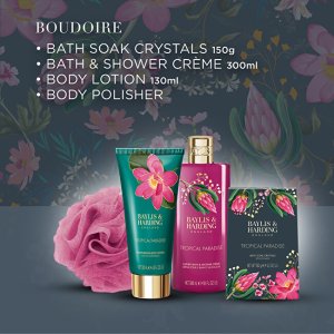 Tato nádherná dárková sada v tubusu ukrývá 4 pečující produkty pro pokožku celého těla. Připravte se na jedinečný zážitek a rozmazlujte svou pokožku pomocí této exkluzivní kolekce produktů s vůní banánu, broskve a pomerančových květů. Obsahuje sametově jemný sprchový a koupelový krém, vyživující tělové mléko, krystaly do koupele pro relaxaci a tělovou houbičku pro dokonalý pocit čistoty. Tato sada je nejen krásným důkazem lásky, ale také praktickým darem, který vybízí k relaxaci. Trendy kolekce Boudoire -Tropical Paradise přináší exotický květinový design s moderním nádechem a špetkou luxusu. Odvážná paleta fuchsiové růžové a smaragdově zelené je doplněna zlatými detaily, které celé řadě dodávají výjimečný charakter. Pečující produkty a nádherné dárkové sady doprovází tropická vůně banánu, broskve a pomerančového květu. Vlastnosti: • čistí, hydratují a pečují o pokožku celého těla • s dlouhotrvající, tropickou vůní • dobře se vstřebávají do pokožky • v luxusním balení Sprchový a koupelový krém Tento nádherně hladký a bohatý krém je šetrný k pokožce, účinně čistí a vytváří intenzivní pěnu, která zanechá pokožku těla hydratovanou a jemně provoněnou. Použití: Naneste na vlhkou pokožku nebo vlijte do teplé vopdní lázně. Vytvořte krémovou pěnu a důkladně opláchněte. Tělové mléko Vyživující mléko dodává pokožce potřebnou hydrataci a úlevu od pocitu suchosti. Zanechává ji hebkou, vláčnou a příjemně provoněnou tropickými tóny. Použití: Naneste na suchou a čistou pokožku a vmasírujte dokud se zcela nevstřebá. Krystaly do koupele Voňavé krystalky dodají koupeli nový rozměr. Provoní celou lázeň a zanechají pokožku hebkou a hladkou na dotek. Použití: Nasypte do teplé vodní lázně, ponořte se do smyslné vůně a relaxujte. Mycí houba Mycí houba dokonale zbaví pokožku špíny a nečistot. Zároveň šetrně exfoliuje, odstraní odumřelé buňky, masíruje a podporuje krevní oběh. Skutečný zázrak pro Vaši pokožku. Doplňující informace: • Vegan & Cruelty Free