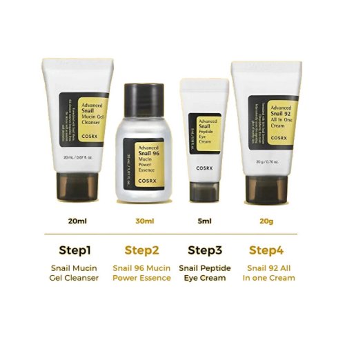 Čisticí pleťový gel Advanced Snail (Mucin Gel Cleanser) 20 ml Pleťová esence Advanced Snail 96 (Mucin Power Essence) 30 ml Oční krém s hlemýždím sekretem Advanced Snail Peptide (Eye Cream) 5 ml Regenerační pleťový krém Advanced Snail 92 (All in One Cream) 20 g