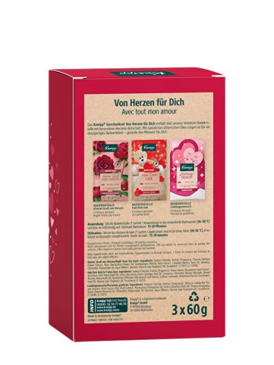 Dárková sada Kneipp Pro Tebe s motivy srdíček a velkým výřezem ve tvaru srdce skrývá 3 koupelové soli s okouzlujícími vůněmi. Sada obsahuje: