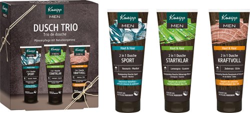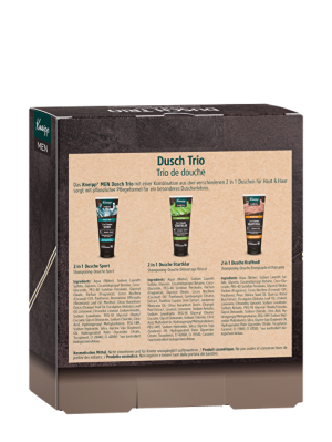 Na dobrodružné cesty, běžná všední rána i sportovní tréninky. Pánské sprchové gely dodají odvahu, radost a energii. V dárkové sadě Kneipp Sprchové trio pro muže najdete 3 sprchové gely se spoustou přírodních výtažků a olejů. Všechny můžete použít na tělo i vlasy. Díky kokosovému oleji a panthenolu dodají potřebnou dávku péče a hydratace. Sprchové gely obsahují esenciální oleje, které podporují sílu, optimismus, odvahu i koncentraci. Ucítíte například rozmarýn, pomerančovou kůru, eukalyptus, borovici nebo citronovou trávu.