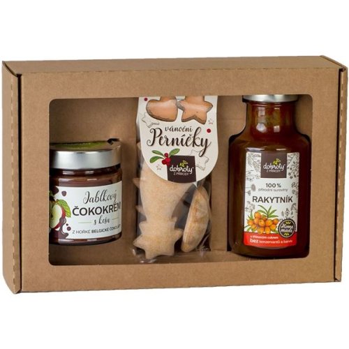 • Sada obsahuje: Vánoční perníčky (40 g), jablkový čokokrém z belgické hořké čokolády s kešu (200 g), Rakytník, nápojový koncentrát ze 100% přírodních surovin (250 ml)