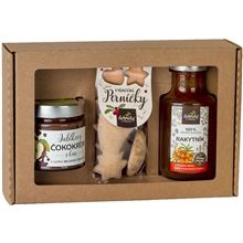 Sada obsahuje: Vánoční perníčky (40 g), jablkový čokokrém z belgické hořké čokolády s kešu (200 g), Rakytník, nápojový koncentrát ze 100% přírodních surovin (250 ml) Rozměr: 25,8 x 17 x 7,4 cm