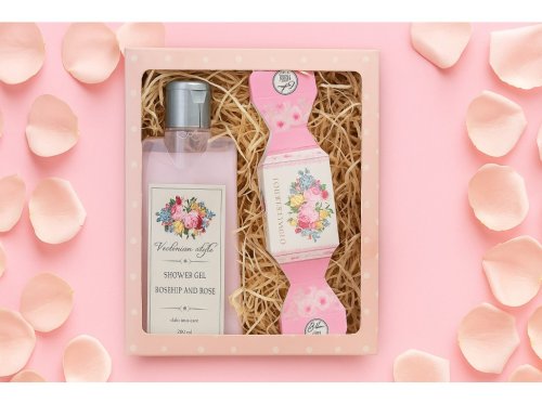 Kosmetická sada pro ženu Victorian Style Vás přenese do kvetoucí zahrady plné růží každým sprchováním a mytím. Tento svěží sprchový gel se stará o vaši pokožku a zanechává vás voňavou jako když procházíte růžovým sadem. Každé mýdlo je ručně vytvořeno s láskou a pečlivostí. S vůní růže přináší tento malý klenot do vaší koupelny krásu a noblesu.
