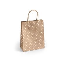 taška z kraftového papíru s ozdobnými metalickými puntíky alternativa igelitových tašek taška je lepená, má ploché dno, kroucené ucho rozměr 25 x 10 x 20 cm gramáž 160 g/m2 balení 5 ks