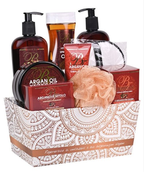 Krásné dárkové balení kosmetiky s bio arganovým olejem pro péči o pokožku těla i obličeje ve stylové papírové krabičce. Arganový olej neboli marocký poklad je jedním z nejvzácnějších olejů na světě. Přirozeně chrání pokožku, navrací jí pružnost a jemnost. Znatelně vyhlazuje drobné vrásky, má skvělé hydratační, vyživující a regenerační účinky. Lze jej použít i k regeneraci poškozených vlasů a nehtů. Je vhodný pro všechny typy pokožky a pleti. Díky svému jedinečnému složení je považován za přírodní elixír krásy a mládí. Dárkové balení obsahuje: