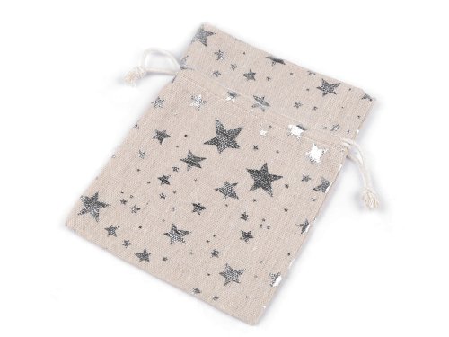 Dárkový pytlík s metalickým potiskem hvězd poslouží na zabalení malých dárků, např. kosmetiky. Může být i krásnou dekorací na Vánoce. Len, ze kterého je vyrobený, je kvalitní a pevný. Pytlík snadno uzavřete pomocí dvou bavlněných stahovacích šňůrek.