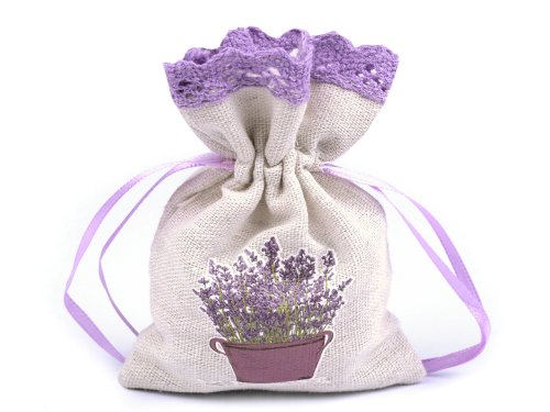 Plátěný dárkový pytlík je ozdobený potiskem květů levandule. [Plátno má hrubší strukturu, která působí jako imitace juty.] Nahoře je olemovaný paličkovanou krajkou. Snadno se uzavírá pomocí dvou stahovacích saténových šňůrek. Pytlík působí luxusně, můžete do něj zabalit dárky, uschovat vaše osobní poklady nebo naaranžovat voňavé sušené květy.
