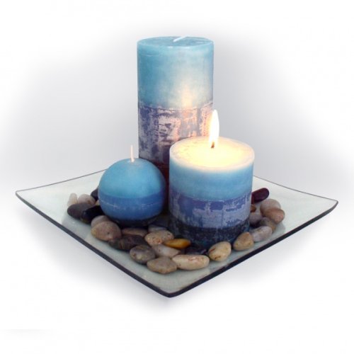 Dárkový set 3 ks svíček na skleněném podstavci a kamínky je vhodný nejen jako dárek, ale i k dekoraci a zpříjemnění chvil strávených doma. Nezapomeňte prosím dbát na bezpečnost Vašeho domova a držte se na svíčce uvedených bezpečnostních piktogramů. Dárková sada obsahuje: podnos 20,5 x 20,5 x 1,5 cm svíčka kulatá 6 x 6 cm svíčka střední 6,8 x 7,4 cmsvíčka velká 6,9 x 12,1 cmkameny. Materiál: parafín. Vůně borůvka.