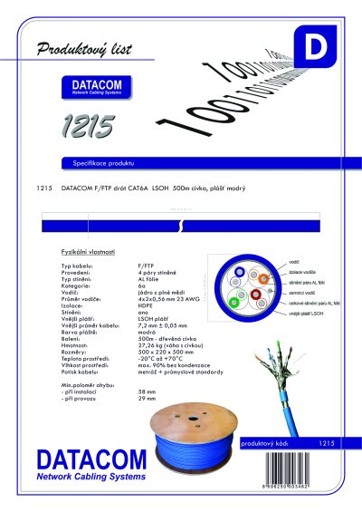 *CAT6A (Class Ea *přenosová rychlost: 10GBit/s *podporovaný protokol: 10GBase-T a nižší *šířka přenosového pásma: 500 MHz *23 AWG *4 x 2 x 0,56 z plné mědi *typ vodiče: drát *průměr kabelu(+-0.3mm): 8.0 mm *izolace vodičů: FMPE *průměr pláště izolace vodičů (+-0.05mm): 1.35 mm *stíněné provedení F/FTP (AL fólie celkově i jednotlivé páry) *zemnící drát 1/0.4 mm *LSOH plášť (třída reakce na oheň - Eca) *barva pláště modrá *barva vodičů: BÍLÁ - MODRÁ BÍLÁ - ORANŽOVÁ BÍLÁ - ZELENÁ BÍLÁ - HNĚDÁ