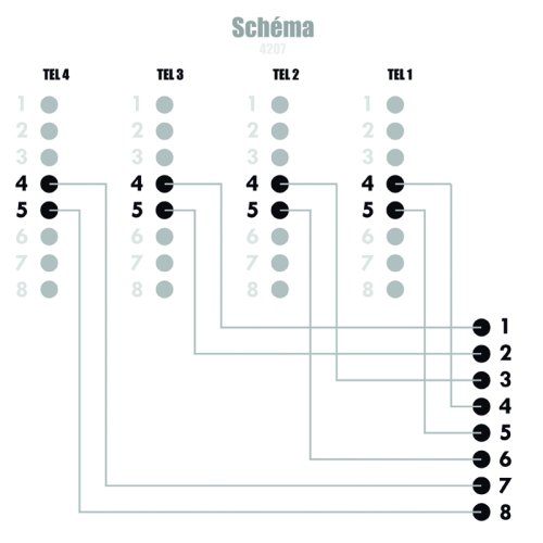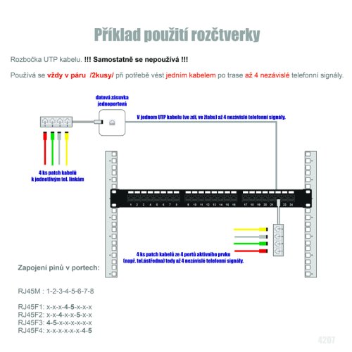 Tato Y rozdvojka dovoluje rozdělit jeden port UTP cat.3 kabeláže na čtyři samostatné telefonní linky (2 žíly) do jednoho 4 párového kabelu.