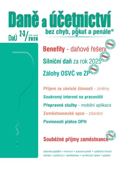 Autor: Ing. Martin Děrgel, Ing. Ivan Macháček, Ing. Václav Benda, Ing. Antonín Daněk, Ing. Pavel Novák <br> <br> Termín pro podání daňového přiznání k silniční dani za rok 2025 je nejpozději do 2. února 2026. Kdo bude za rok 2025 přiznání podávat? Co je předmětem daně a jaká jsou osvobození od daně? <br> Jaké je daňové řešení zdravotních a volnočasových benefitů u zaměstnance a zaměstnavatele v roce 2026? Odpověď nalezněte v rubrice Aktuálně.