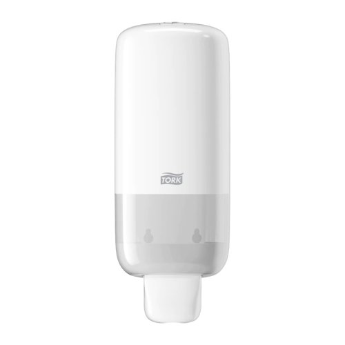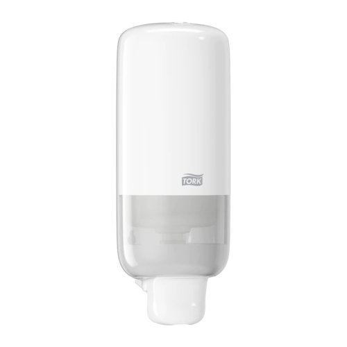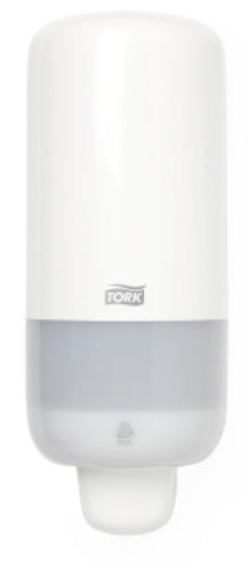 Dávkovač na tekuté mýdlo značky Tork S-Box S4 v bílé barvě s obsahem 475 ml a hmotností 0,40 kg má ergonomický design a disponuje tlačítkem pro pohodlné použití.