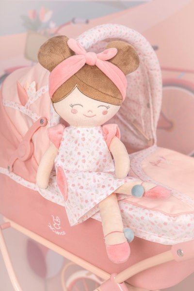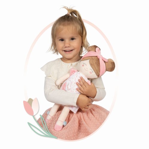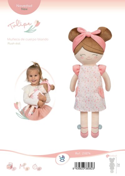 DeCuevas 21074 Plyšová panenka Tulipe 2025 - 36 cmPlyšová panenka Tulipe je malá slečna ze stejnojmenné kolekce, která je novinkou roku 2025. Tulipe je, jak již sám název napovídá, kolekce plná tulipánů v překrásně sladěných teplých pastelových lososových barvách. Světlejší a tmavší odstíny barev jsou vkusně doplněné drobným květinovým vzorem ve stejných tónech na bílosmetanovém podkladu. Tento motiv ještě navíc u kočárků umocňují svým tematickým tvarem i překrásné, jako tulipán vypadající tašky. Květ tulipánu zdobí i dřevěné výrobky této kolekce. Panenka je vyrobena z vysoce kvalitního hladkého lesklého plyše a je pratelná (ručně na 30 °C). Díky své velikosti a nízké váze je ideální společnicí každé malé holčičky nejenom na cestách, ale díky měkkému materiálu je příjemná i na mazlení do postýlky. Panenka je balena v igelitovém obalu. Velikost 36 cm. Doporučený věk 12m+.Doplňující informace:• Nádherný španělský design• Materiál: plyš, polyester, duté vlákno• Pratelná ručně na 30 °C• Rozměry samotné panenky: 15 x 8 x 36 cm (š x d x v)• Baleno v ochranném igelitovém obalu • Rozměry balení: 15 x 8 x 36 cm (š x d x v)• Váha balení: 0,12 kg• Doporučený věk od 12 měsíců