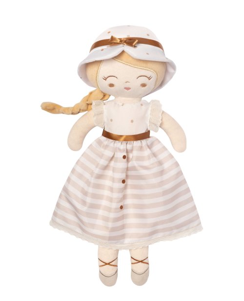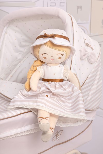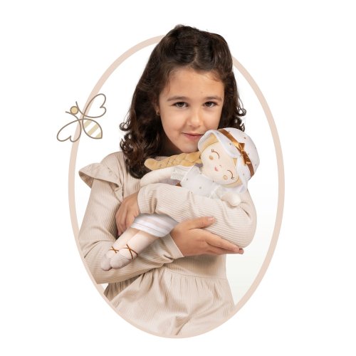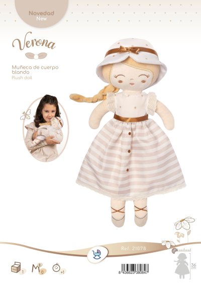 DeCuevas 21078 Plyšová panenka Verona - 36 cmPlyšová panenka Verona, novinka roku 2025, je malá slečna ze stejnojmenné, velmi úspěšné kolekce z roku 2024. Tato decentní kolekce je celá nesena v jemných pastelových přírodních barvách i vzorech. Kombinace světle béžové a bílé s roztomilými puntíky nebo proužky doplňuje světle hnědé úzké lemování, které zdůrazňuje dokonalost tvarů a krásně ladí s hnědými madly kočárků. Přírodní styl kolekce podtrhují aplikace mašliček zobrazující okvětní lístky a drobné výšivky včeliček. Panenka je vyrobena z vysoce kvalitního hladkého lesklého plyše a je pratelná (ručně na 30 °C). Díky své velikosti a nízké váze je ideální společnicí každé malé holčičky nejenom na cestách, ale díky měkkému materiálu je příjemná i na mazlení do postýlky. Panenka je balena v igelitovém obalu. Velikost 36 cm. Doporučený věk 12m+.Doplňující informace:• Nádherný španělský design• Materiál: plyš, polyester, duté vlákno• Pratelná ručně na 30 °C• Rozměry samotné panenky: 15 x 8 x 36 cm (š x d x v)• Baleno v ochranném igelitovém obalu • Rozměry balení: 15 x 8 x 36 cm (š x d x v)• Váha balení: 0,12 kg• Doporučený věk od 12 měsíců
