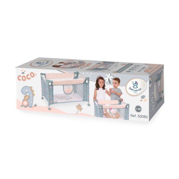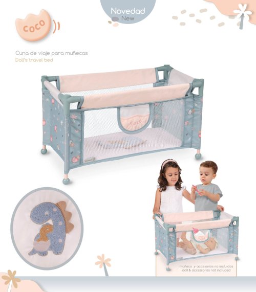 DeCuevas 50080 Cestovní postýlka pro panenky COCO 2024 patří do stejnojmenné kolekce, která je novinkou roku 2024 a nabízí nejen kočárky, ale i jiné doplňky nejen pro malé slečny a jejich panenky, ale také chlapce. V hravé kolekci COCO je dominantní obrázek dinosauří maminky se svým roztomilým mláďátkem, které nese na zadečku ještě vaječnou skořápku. Potisk malého dinosauříka na jemně holubičí šedomodré látce je základem celé kolekce, již zdobí prvky v pískové nebo narůžovělé barvě, která se promítá i do většiny nosných konstrukcí.