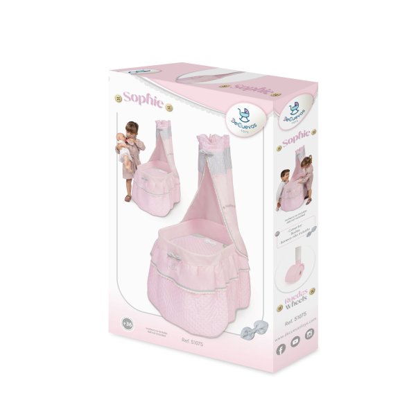 DeCuevas 51075 Pojízdná postýlka pro panenky s nebesy a peřinkou Sophie 2025 patří do stejnojmenné kolekce, která je novinkou roku 2025 a nabízí nejen zmíněné kočárky, ale i jiné doplňky pro malé slečny a jejich panenky. Něžná dívčí kolekce Sophie je nepřehlédnutelná pro každé děvčátko. Světle růžová barva dominuje celé kolekci. Doplněná je o světle šedivé a bílé kraječky a mašličky, které zdobí všechny výrobky této rozmanité kolekce a ještě více podtrhují nádech romantiky.
