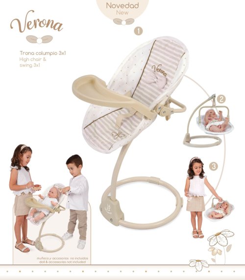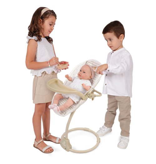 DeCuevas 51578 Multifunkční jídelní židlička a houpačka pro panenky 3 v 1 Verona 2024 patří do stejnojmenné kolekce, která je novinkou roku 2024 a nabízí nejen zmíněné kočárky, ale i jiné doplňky pro malé slečny a jejich panenky. Tato decentní kolekce je celá nesena v jemných pastelových přírodních barvách i vzorech. Kombinace světle béžové a bílé s roztomilými puntíky nebo proužky doplňuje světle hnědé úzké lemování, které zdůrazňuje dokonalost tvarů a krásně ladí s hnědými madly kočárků. Přírodní styl kolekce podtrhují aplikace mašliček zobrazující okvětní lístky a drobné výšivky včeliček. Doplňky a vybavení:• Odnímatelné oboustranné sedátko-lehátko s bezpečnostními popruhy pro uchycení panenky, které může být díky dvěma různým způsobům připevnění na moderní konstrukci využito jako jídelní židlička nebo houpačka, ale i samostatně jako nosítko• Odnímatelný plastový pultík na krmení• Rozměry židličky: 31 × 30 x 60 cm (d x š x v)• Výška k jídelnímu pultíku: 50 cm • Panenka s doplňky nejsou součástí baleníDoplňující informace:• Nádherný španělský design• Precizní zpracování• Velmi snadná manipulace během samotné hry• Materiál: kov, plast, textil• Baleno v krabici v barvách kolekce• Rozměry balení: 32 x 10 x 40 (d x š x v)• Váha balení: 1,24 kg• U vybraných modelů je na obalech QR kód s video návodem na sestavení • Doporučený věk od 3 letDeCuevas 51578 Multifunkční jídelní židlička a houpačka pro panenky 3 v 1 Verona 2024, ze stejnojmenné kolekce, která je novinkou roku 2024. Ta