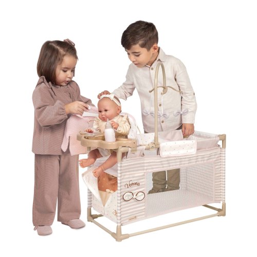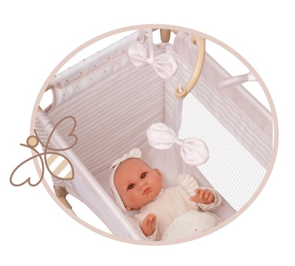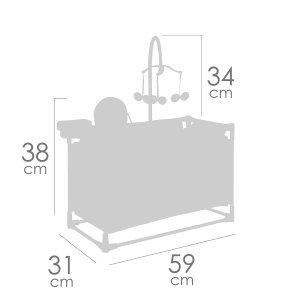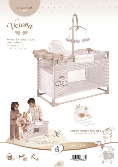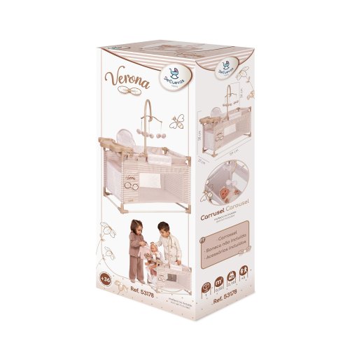 DeCuevas 53178 Moje první postýlka pro panenky s hracím centrem Verona 2025 patří do stejnojmenné, velmi úspěšné kolekce z roku 2024, která nabízí nejen zmíněné kočárky, ale i jiné doplňky pro malé slečny a jejich panenky. Tato decentní kolekce se celá nese v jemných pastelových přírodních barvách i vzorech. Kombinace světle béžové a bílé s roztomilými puntíky nebo proužky doplňuje světle hnědé úzké lemování, které zdůrazňuje dokonalost tvarů a krásně ladí s hnědými madly kočárků. Přírodní styl kolekce podtrhují aplikace mašliček zobrazující okvětní lístky a drobné výšivky včeliček.Doplňky a vybavení:• Kolotoč s mašličkami zobrazující okvětní lístky (výška 34 cm)• Přebalovací pultík (17 x 27 cm)• Jídelní židlička a plastový set s lahví, miskou a příborem• Lůžková část (42 x 28 cm) se síťovaným okénkem • Malá šatna na zip (27 x 10 x 20 cm) s tyčí a 3 ramínky na oblečení pro panenky • Rozměry postýlky: 59 x 31 x 38 cm (d x š x v) • Panenka a oblečení není součástí baleníDoplňující informace:• Nádherný španělský design• Precizní zpracování• Velmi snadná manipulace během samotné hry• Materiál: kov, plast, textil• Baleno v krabici v barvách kolekce• Rozměry balení: 55 x 14,3 x 23,5 cm (d x š x v)• Váha balení: 2 kg• U vybraných modelů je na obalech QR kód s videonávodem na sestavení • Doporučený věk od 3 letDeCuevas 53178 Moje první postýlka pro panenky s hracím centrem Verona 2025 ze stejnojmenné, velmi úspěšné kolekce z roku 2024 je u holčiček oblíbená díky svému rozmanitému pří