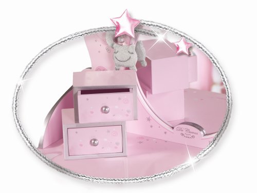 je z překrásné růžovostříbrné pohádkové kolekce s vílou a žabičkou. Tuto kolekci zdobí jemné třpytivé krajkové lemování s flitry v šedostříbrné barvě. Čelo, deska a nohy stolku jsou zdobeny krásnými potisky, a vše ještě doplňují úchytky na šuplíčkách ve stříbrné barvě a malá zavěšená stříbrná žabička s měsíčkem. Bez taburetky s jemně třpytivým krajkovým lemováním s flitry by tento set nebyl tak pohádkově kouzelný.