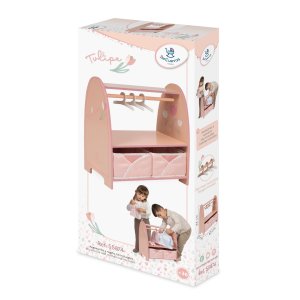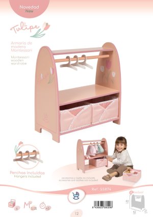 DeCuevas 55874 Dřevěný šatní věšák na oblečení pro panenky Tulipe 2025 patří do stejnojmenné kolekce, která je novinkou roku 2025 a nabízí výběr výrobků od jídelních sad přes postýlky a kočárky až po dřevěný nábytek pro panenky. Tulipe je, jak již sám název napovídá, kolekce plná tulipánů v překrásně sladěných teplých pastelových lososových barvách. Světlejší a tmavší odstíny barev jsou vkusně doplněné drobným květinovým vzorem ve stejných tónech na bílosmetanovém podkladu. Tento motiv ještě navíc u kočárků umocňují svým tematickým tvarem i překrásné, jako tulipán vypadající tašky. Květ tulipánu zdobí i dřevěné výrobky této kolekce.Doplňky a vybavení:• Šatní tyč v pastelové barvě• 3 dřevěná ramínka • 2 odkládací místa z toho jedno na horní polici • 2 skládací košíky na různé drobnosti 21 x 20 x 11 cm (š x h x v)• Rozměry věšáku: 42 × 21 × 44 cm (š x h x v)• Oblečení a doplňky nejsou součástí baleníDoplňující informace:• Nádherný španělský design• Precizní zpracování• Materiál: MDF, masivní dřevo, kov• Baleno v krabici v barvách kolekce• Rozměry balení: 21,6 x 7,2 x 45 cm (d x š x v) • Váha balení: 3 kg• U vybraných modelů je na obalech QR kód s videonávodem na sestavení • Doporučený věk od 3 letDeCuevas 55874 Dřevěný šatní věšák na oblečení pro panenky Tulipe 2025 ze stejnojmenné kolekce, která je novinkou roku 2025, je díky svým jemným pastelovým barvám krásným doplňkem dívčího pokojíčku a potěší jistě každou malou slečnu. Šatní tyč s ramínky poskytne dostatek prostoru pro u