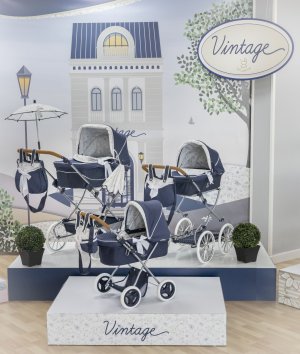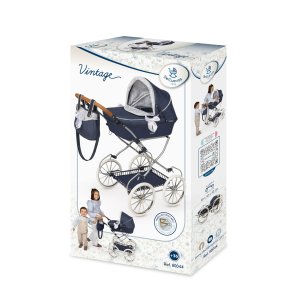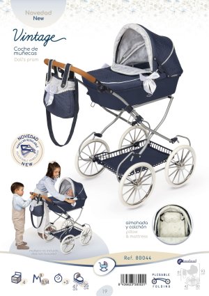 DeCuevas 80044 Skládací kočárek pro panenky s taškou Vintage 2025 - 81 cm patří do stejnojmenné kolekce, která nabízí nejen zmíněné kočárky, ale i jiné doplňky pro malé slečny a jejich panenky. Tato decentní stylová kolekce v kombinaci jen dvou barev je nerušená jiným barevným efektem. Jedná se o tmavě modrou a ledově bílou s jemným modrým potiskem. Jednoduché ozdoby ve tvaru bílých mašlí a úzké zdobné lemy s malými zoubky působí čistě. Do celého stylu vintage perfektně zapadají i madla kočárků z materiálu imitujícího dřevo či kůži, což v dnešní době vídáme často i na reálných dětských kočárcích.