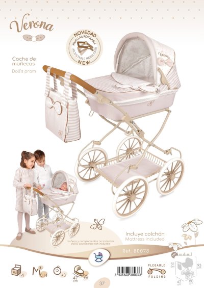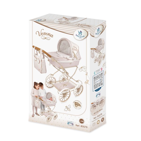DeCuevas 80078A Skládací kočárek pro panenky s taškou Verona 2025 - 81 cm patří do stejnojmenné, velmi úspěšné kolekce z roku 2024, která nabízí nejen zmíněné kočárky, ale i jiné doplňky pro malé slečny a jejich panenky. Tato decentní kolekce se celá nese v jemných pastelových přírodních barvách i vzorech. Kombinace světle béžové a bílé s roztomilými puntíky nebo proužky doplňuje světle hnědé úzké lemování, které zdůrazňuje dokonalost tvarů a krásně ladí s hnědými madly kočárků. Přírodní styl kolekce podtrhují aplikace mašliček zobrazující okvětní lístky a drobné výšivky včeliček.