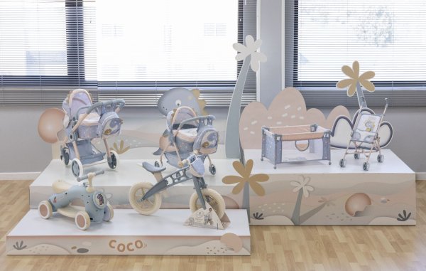 DeCuevas 90280 Sportovní kočárek pro panenky tříkolový COCO 2024 - 55 cm patří do stejnojmenné kolekce, která je novinkou roku 2024 a nabízí nejen kočárky, ale i jiné doplňky nejen pro malé slečny a jejich panenky, ale také chlapce. V hravé kolekci COCO je dominantní obrázek dinosauří maminky se svým roztomilým mláďátkem, které nese na zadečku ještě vaječnou skořápku. Potisk malého dinosauříka na jemně holubičí šedomodré látce je základem celé kolekce, již zdobí prvky v pískové nebo narůžovělé barvě, která se promítá i do většiny nosných konstrukcí.