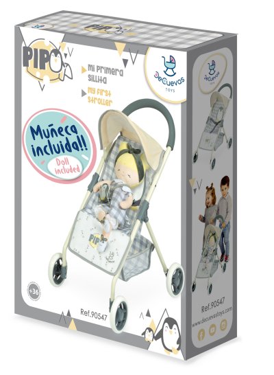 DeCuevas 90547 Sportovní kočárek pro panenky a plyšová panenka PIPO 2022 - 55 cm patří do stejnojmenné kolekce, která je novinkou roku 2022 a nabízí krom různých druhů kočárků a nábytku pro panenky i další doplňky pro budoucí hospodyňky. Charakteristická je pro tuto kolekci šedobílá kostka v kombinaci s jednobarevnými šedivými a bílými drobně vzorovanými částmi a doplňky v jemně žluté barvě a již zmíněným tučňákem PIPO.